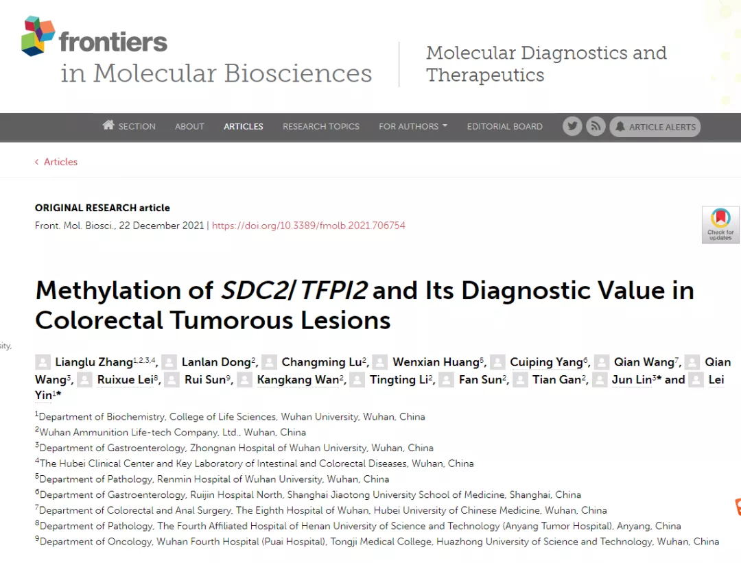 近日,影响因子为5.246的国际学术期刊【 Frontiers in Molecular Biosciences 】上发表了一篇以艾长康产品为原型的名为《Methylation of SDC2/TFPI2 and Its Diagnostic Value in Colorectal Tumorous Lesions 》的医学论文。